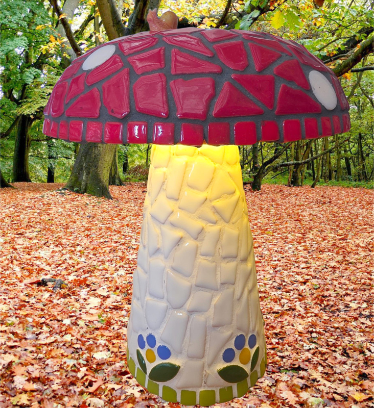 Maak zelf een herfstige mozaïeklamp! Mozaïekpakket Paddestoel met licht, keramiek & glastegels, geen gereedschap nodig. Met schattig slakje bovenop!